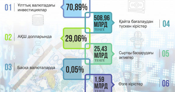 Zeınetaqy aktıvterimen satyp alynǵan qarjy quraldary nomınasııalanǵan valıýtalardyń ınvestısııalyq portfeli jóninde ulttyq valıýtadaǵy ınvestısııalar – 70,89%, AQSh dollarynda – 29,06%, basqa valıýtalarda – zeınetaqy aktıvteri portfeliniń 0,05% bolyp otyr. Baǵaly qaǵazdar boıynsha syıaqy túrindegi kirister, onyń ishinde depozıtter men keri REPO operasııalary jáne baǵaly qaǵazdardy naryqtyq qaıta baǵalaýdan túsken kirister 508,96 mlrd teńgeni, syrtqy basqarýdaǵy aktıvter – 25,43 mlrd teńgeni qurady, ózge kirister 1,59 mlrd teńge boldy.