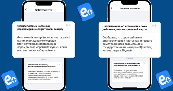 Atalǵan jańashyldyq azamattarǵa qujattyń jaramdylyq merzimi týraly 30 kún buryn eskertýge múmkindik beredi. Jiberilgen push-habarlamalar eGov mobile qosymshasynyń «Habarlamalar» bóliminde qoljetimdi. Eger mobıldi qosymsha ornatylmaǵan bolsa, paıdalanýshyǵa qosymshany júkteýge arnalǵan siltemesi bar 1414 nómirinen jańa habarlama kelgeni týraly SMS jiberiledi.