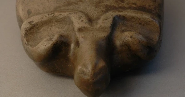 Tas músin mýzeıge 1986 jyly tapsyrylǵan. Ol Qostanaı qalasynyń mańyndaǵy Qyzyl partızan keńsharynyń aýmaǵynan tabylǵan. Aıtpaqshy, 1976 jyly dál osy tóńirekten arheologııa ǵylymyndaǵy tyń jańalyqtyń biri sanalǵan «Tobyl oıshyly» da tabylǵan edi. Músin aqshyl sary tústi iri túıirshikti qumtastan qashaý jáne tegisteý tehnıkasymen jasalǵan. Bıiktigi – 19 santımetr. Ǵalymdar ony eneolıt dáýirinde jasalǵan dep joramaldaıdy. Iаǵnı bizdiń zamanymyzǵa deıingi III myńjyldyqtyń sońy men II myńjyldyqtyń bas kezine sáıkes keledi. Músinniń beti syzylmaǵan, jaǵy jaılap keýdeniń joǵary jaǵyna ulasady, tek ıegi ǵana alǵa shyǵyp tur. Aýzy shyǵyńqy beder emes, oıylǵan syzyqpen kórsetilgen. Denesiniń aldyńǵy bóligi óńdelmegen jáne eshqandaı oıyǵy joq. Dóńgelengen arqasy eptep óńdelgen. Qoly men aıaǵy bederlenip berilgen. Músin ornyqty, biraq tik osten sál aýytqyǵan.