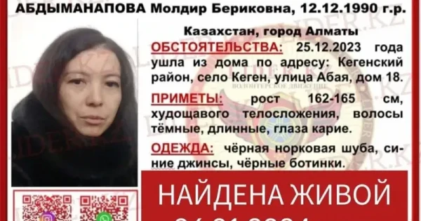 2023 jyldyń 25 jeltoqsanynda Almaty oblysy aýmaqtyq Polısııa basqarmasyna iz-túzsiz joǵalǵan 1990 jyly týǵan Móldir Ábdimanapovanyń týystary habarlasty.