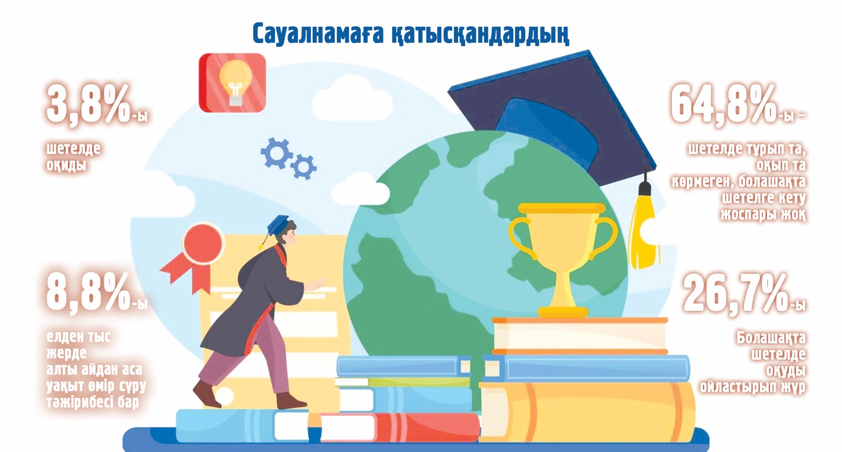 Elimizdegi bilim salasy jyl sanap damyp keledi. Biraq bilim kókjıegi keń órender shetel asyp ketýge asyq. Áýeli osy úrdiske ǵylymı kózqaraspen qarap kóreıikshi. Jastardyń áleýmettik-saıası ahýaly mıgrasııalyq kóńil kúıine áser etetini beseneden belgili. Osy máseleni Frıdrıh Ebert qory zerttegen edi. Biz bilim salasyna úńileıik. Zertteý nátıjelerine sáıkes Qazaqstan jastarynyń basym bóligi elde oqyǵysy keledi. Biraq «shetelde oqý – bilim jetildirýdiń, jaqsy jumys tabýdyń birden-bir amaly» dep oılaıtyndar da jetedi. Ásirese Batys elderinde bilim alý – mártebe. Sondyqtan jastardyń kóbi Batys elderine umtylady. Qordyń derekterine súıensek, Qazaqstan jastary «Shetelde oqýǵa (oqýyńyzdy jalǵastyrýǵa) múmkindigińiz bolsa, qaı eldi tańdar edińiz?» degen suraqqa jaýap bergen kezde, Batys elderine basymdyq bergen. Statıstıka boıynsha, AQSh-ta bilim alǵysy keletinder – 29 paıyz, al Eýropalyq Odaqtyń bilim júıesin ozyq kóretinder – 23,4 paıyz, Reseıde oqyǵysy keletinder 23,3 paıyz bolǵan.