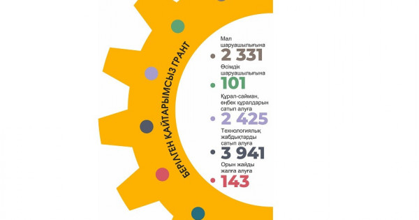 Qaıtarymsyz granttyń sommasy – 400 AEK (1 476 800 teńge) shamasynda. Bıyl mal sharýashylyǵyna – 2 331, ósimdik sharýashylyǵyna – 101, qural-saıman, eńbek quraldaryn satyp alýǵa – 2 425, tehnologııalyq jabdyqtardy satyp alýǵa – 3 941, oryn jaıdy jalǵa alýǵa – 143 qaıtarymsyz grant berilgen. Grant alǵandardyń tiziminde kópbalaly otbasylardyń múshelerine – 5 646, múgedektigi bar adamdarǵa – 1 446, múgedektigi bar balalardy tárbıelep otyrǵan ata-analarǵa – 1 045, ataýly áleýmettik kómek alýshylarǵa – 253, asyraýshysynan aıyrylý boıynsha tólem alýshylarǵa – 365, qonys aýdarýshylarǵa – 151 jáne qandastarǵa – 35 grant berildi.