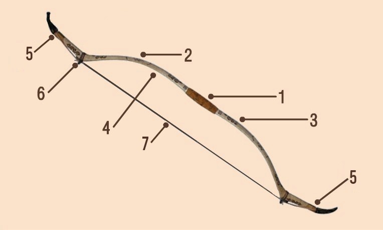 Sadaq ataýlary. 1. Tutqa. 2,3. Eki jaq ıini, 4. Iinniń astary. 5. Suǵyn. 6. Tobyq. 7. Adyrna