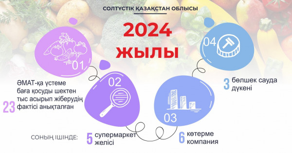 Áleýmettik, bilim berý, medısınalyq mekemelerdiń azyq-túlik ónimderin satyp alý máselesi de tekserilip, munda da birqatar óreskeldik tabylǵan. Sonyń ishinde balabaqshalardyń azyq-túlik ónimderin joǵary baǵamen satyp alý faktileri anyqtalǵan. Sonymen birge oblystaǵy bilim berý uıymdarynda áleýmettik mańyzdy taýarlardyń satyp alý baǵasyn tómendetý jumystary júrgizilip, olardyń qorytyndysy negizinde 458 mektepke deıingi mekemede 17 myń balanyń ata-anasyna qoldaý qorynan aqsha únemdeýge múmkindik týǵan.
