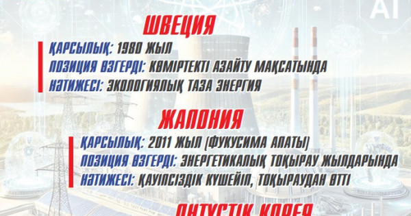 – Atom elektr stansasyna basynda qarsy bolyp, keıin onyń artyqshylyǵyn túsinip, paıdalanǵan birneshe memleket bar. Bul elder alǵashynda AES qurylysyna qarsylyq tanytqanymen, keıinnen onyń ekonomıkalyq, ekologııalyq, sonymen qatar energetıkalyq artyqshylyǵyn uǵynyp, atom energetıkasyn ózderiniń basty energııa kózderiniń birine aınaldyrdy. Bul týraly tolyq aqparatty ınfografıka túrinde bereıin. Qarap shyǵyńyz.