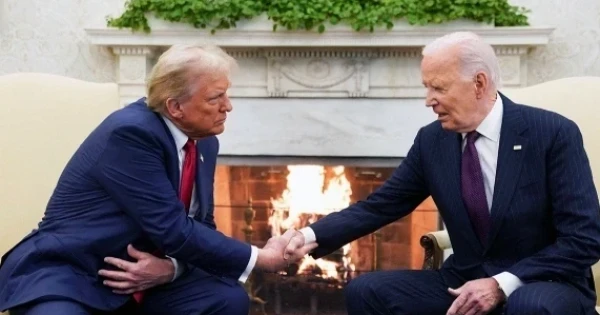 Saıası qarsylastar alaý ottyń janynda emen-jarqyn sóılesip, qol alysqan. Qos saıasatker bılikti esh kedergisiz almasýǵa ýaǵdalasty. 2020 jylǵy saılaýda Baıden Tramptan basym tústi. Biraq bıyl 6 qarashada ótken dodada 78 jastaǵy respýblıkalyq Tramp qaıta saılandy. Ol 81 jastaǵy demokrat Baıden óz ornyna usynǵan vıse-prezıdent Kamala Harrısti jeńgen bolatyn.