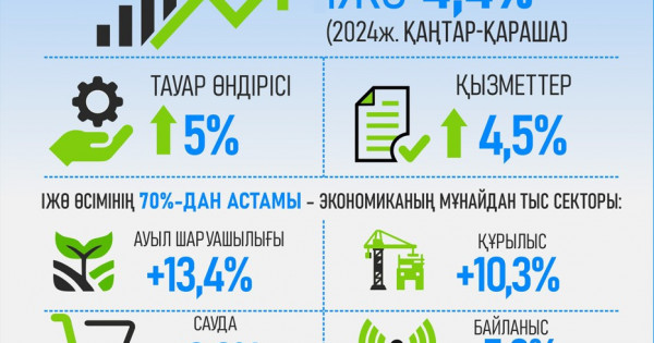 Aldyn ala baǵalaý boıynsha bıylǵy 11 aıda ishki jalpy ónim (IJО́) ósimi 4,4% boldy, ol negizinen munaıdan tys sektordy damytýmen qamtamasyz etilgen. Ekonomıka ósiminiń 70%-dan astamy óńdeý ónerkásibi, saýda, aýyl sharýashylyǵy jáne qurylys esebinen qalyptasty. Sala-salaǵa jiktep aıtsaq, aýyl sharýashylyǵynda jalpy ónim shyǵarý 13,4%-ǵa ósken, bul 2011 jyldan bergi eń joǵary kórsetkish. Qurylys salasynda – 10,3%, saýdada – 8,2%, kólik qyzmetterinde – 8,1%, baılanysta – 5,3%, óńdeý ónerkásibinde 5,3% ósim bar. Jalpy, atalǵan kezeńde otandyq taýarlar óndirisi 5%,-ǵa, kórsetilgen qyzmetter 4,5%-ǵa artqan. Negizgi kapıtalǵa salynǵan ınvestısııalar kólemi 3,1%-ǵa kóbeıip, 15,8 trln teńgege jetti.