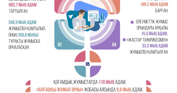 Statıstıkalyq derekterge kóz júgirtsek, memlekettik baǵdarlamalar arqyly jumysqa ornalasqan jastar kóp. Mysaly, byltyr jumyspen qamtýǵa járdemdesýdiń belsendi is-sharalaryna 683,7 myń adam tartylǵan. 546,9 myń adam jumyspen qamtylyp, onyń 358,8 myńy turaqty jumysqa ornalasqan. Sýbsıdııalanatyn jumys oryndaryna 188,2 myń adam barǵan. Onyń ishinde áleýmettik jumys oryndary arqyly 15,5 myń adam, «Jastar tájirıbesimen» 33,3 myń adam jumyspen qamtylǵan. Sol sekildi qoǵamdyq jumystarda 110 myń adam, «Alǵashqy jumys orny» jobasy aıasynda 9,6 myń adam, «Urpaqtar kelisimsharty» jobasymen 420 adam, «Kúmis jas» jobasy arqyly 19,2 myń adam jumys tapqan. Eńbek naryǵynda suranysqa ıe daǵdylarǵa onlaın oqytýmen 57,7 myń jumyssyz qamtylsa, onyń 52,4 myńy oqýdy aıaqtaǵan. «Bastaý bıznes» jobasy boıynsha kásipkerlik negizderine oqytýmen 60,3 myń adam qamtylǵan. Onyń ishinde 37,8 myń adam oqýdy aıaqtap, sertıfıkat alǵan. Qyzmet salasyn tańdaý maqsatynda 214,9 myń adam áleýmettik kásiptik baǵdarlaýdan ótti. Sondaı-aq byltyr halyqtyń áleýmettik osal sanattarynyń jańa bıznes bastamalardy iske asyrýyna 400 AEK (1 476 800 teńge) mólsherinde 8 941 grant berildi.