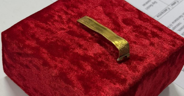 Onyń pikirinshe, altyn japsyrma qobdıshanyń nemese kishkentaı sandyq qaqpaǵynyń topsasy retinde qoldanylǵan bolýy múmkin. Bul buıym órnekteý tásili arqyly jasalǵan. Joǵary bóliginiń aınalasyna ırelengen órnek salynypty. Joǵary jáne tómengi bóligi qoshqar múıiz oıýymen órnektelgen. Topsa retinde bekitýge arnalǵan eki tesigi bar.