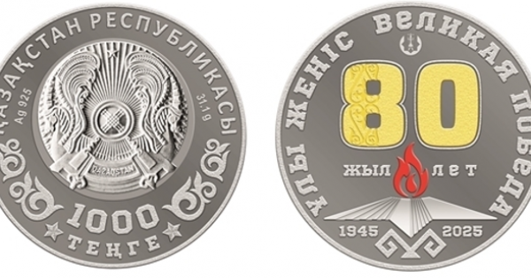 Monetalarda erlikpen qaza tapqan batyrlardy eske túsiretin máńgilik alaý beınelengen. «80» sanynyń ishinde ornalasqan oıý-órnek Jeńis lentasyn beıneleıdi jáne ol Memlekettik Týdyń elementterimen úndestik tapqan.