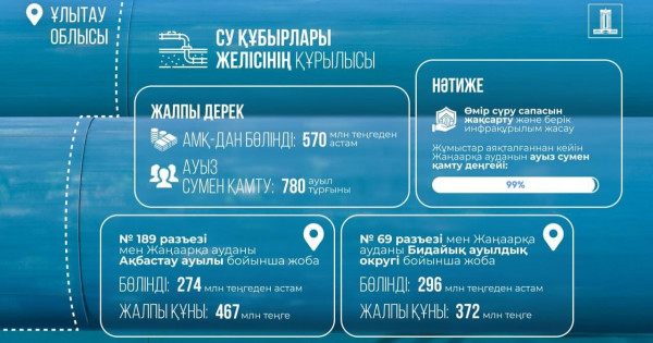Osy jumystar aıasynda Úkimet Ulytaý oblysynda sý qubyry jelilerin tartýǵa Arnaýly memlekettik qordan 570 mln teńgeden astam qarjy bóldi. Jańaarqa aýdanyndaǵy Eralıev aýyldyq okrýgi men Aqbastaý aýylynyń №189 razezindegi qubyr qurylysyna 274 mln teńgeden astam qarjy bólindi. Sondaı-aq osy aýdanǵa qarasty Bıdaıyq aýyldyq okrýgine jańa sý qubyryn tartý josparlanyp otyr. Bul maqsatqa 296 mln teńge qarastyrylǵan.