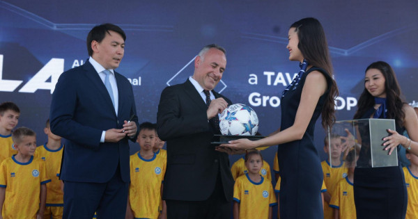 Irgetasyn qalaý rásimi kezinde qurmetti qonaqtar fýtbol dobyna qoltańbalaryn qoıyp, ony jas sportshylarǵa tabystady.