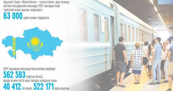 Aýyzeki tilde «Ońtústikten – soltústikke» dep atalyp ketken baǵdarlama aıasynda 2017 jyldan beri teriskeı jáne shyǵys óńirlerge 63 myńdaı adam qonys aýdarǵan. Biraq bul ıgi bastamanyń júzege asyrylýy jetkiliksiz bolyp, atalǵan aımaqtardan basqa jaqtarǵa kóship ketýshilerdiń oısyraǵan ornyn toltyra almaı tur. Saldarynan olardyń bárinde kóshi-qonnyń teris saldosy saqtalyp, turǵyndar sany jyldan-jylǵa azaıyp barady.