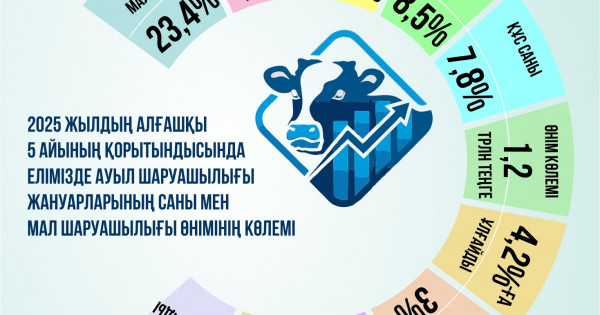 2025 jyldyń alǵashqy bes aıynyń qorytyndysynda elimizde aýyl sharýashylyǵy janýarlarynyń sany men mal sharýashylyǵy óniminiń kólemi turaqty ósimge jetken. Bul týraly Úkimet otyrysynda aýyl sharýashylyǵy mınıstri Aıdarbek Saparov málimdedi.