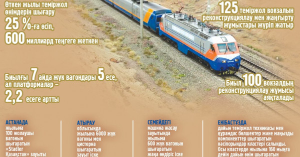 «Jyl sońyna deıin alǵashqy 51 vagon qoldanýǵa beriledi. Sondaı-aq jyl basynda Atyraý oblysynda jylyna 6 000 júk vagony men sısterna shyǵaratyn zaýyt iske qosyldy («Teksol Trans»). Oǵan qosa, jergilikti óndiris úlesin arttyrý maqsatynda ınvestor «Foundry» klasterin salýdy bastady. Zaýyttyń iske qosylýy 2027 jylǵa josparlanǵan. Bularmen birge, bıyl Semeıdegi mashına jasaý zaýytynda jylyna 600 júk vagonyn shyǵaratyn jańa óndiris iske qosylyp otyr», dedi mınıstr.