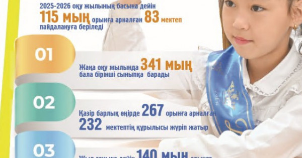 «Memleket basshysynyń tapsyrmalary aıasynda elimizde mektep ınfraqurylymyn júıeli túrde jańǵyrtý jáne keńeıtý jumystary jalǵasyp keledi. Qazir óńirlerde 267 myń orynǵa arnalǵan 232 mekteptiń qurylysy júrip jatyr. 2025–2026 oqý jylynyń basyna deıin 115 myń orynǵa arnalǵan 83 jańa mektep paıdalanýǵa beriledi. Al jyl sońyna deıin taǵy 140 myń orynǵa arnalǵan 111 mekteptiń qurylysy aıaqtalady. Mektep qurylysymen qatar, bıyl 190 myń oqýshyny qamtıtyn 245 mektepte aýqymdy renovasııa baǵdarlamasy iske asyrylady. Onyń shamamen 60%-y aýyldyq jerlerde ornalasqan. Jańa oqý jylyna deıin 99 myń oqýshyny qamtıtyn 127 mekteptegi jóndeý jumystary aıaqtalady. Bilim berý ınfraqurylymyn damytýdyń basty basymdyǵy – balalarǵa jaıly jáne qaýipsiz oqý ortasyn qurý. Bul jumystardyń ýaqytyly jáne sapaly oryndalýy jergilikti jerlerdegi jumysqa tikeleı baılanysty. Osy baǵyttaǵy jumysty jandandyryp, tıisti baqylaýdy qamtamasyz etý qajet», degen edi mınıstr. Úkimet taratqan aqparatqa súıensek, 2025 jyly 69 myńnan astam oqýshysy bar 1000-nan astam aýyl mektebi jańǵyrtylady, al 680 mektepke shamamen 1 100 zamanaýı pándik kabınet satyp alynady.