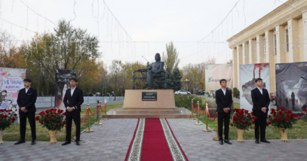 Shara barysynda qatysýshylar qazaq teatr óneriniń korıfeıi Asqar Toqpanovtyń eskertkishine taǵzym etip, gúl shoqtaryn qoıdy.