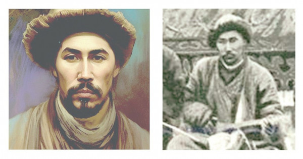 Fotoda tórtinshi otyrǵan, dombyra ustaǵan, pushpaq bórik, jyltyr etigi de kórinip, sopaq bet adam bireý ǵana ekenin kóremiz.