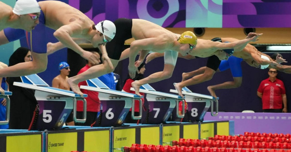 El namysyn qorǵaǵandar Ádilbek Mýsın, Maksım Skazobsov, Danııl Cherepanov, Ǵalymjan Balabek. Osy otandastarymyz erkin stılde 4x200 metrge júzý estafetasynda kúmis júldege qol jetkizdi.