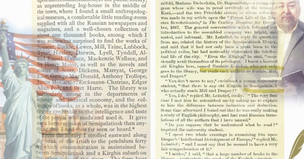 «Onda on eki ne on bes jer aýdarylǵan kisi boldy, olardyń arasynda myrza Lobanovskıı, Madam Dıcheskýla, Dr. Bogomoles (áıeli shahtalarǵa katorgalyq eńbekke jegilgen jas dáriger), sondaı-aq men buryn «Orys revolıýsıonerleriniń túrmedegi ómiri» týraly «The Century Magazine»-de (1887 j., jeltoqsan) jarııalaǵan maqalamda atap ótken Prısedskıı ápkeli-sińlileri de osynda edi. Jınalǵan qaýymmen bolǵan jalpy áńgime baısaldy da beıresmı túrde ótti. Leontev myrza meniń suraqtaryma jaýap bere otyryp, Semeı kitaphanasynyń tarıhyn aıtyp berdi. Ol bul kitaphana saıası jer aýdarylǵandarǵa zor paıda ákelip qana qoımaı, qalanyń zııatkerlik ómirine de eleýli serpin bergenin atap ótti.