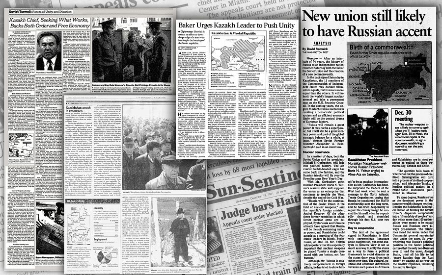 KSRO-nyń shańyraǵy shaıqalyp, aqtyq demin alyp jatqanda álem nazary keńester eline aýǵany belgili. Sol tusta álemniń beldi-beldi basylymdary alyp derjavadaǵy ahýal týraly jıi-jıi jazdy. Ásirese KSRO ydyraıtyny, onyń quramyndaǵy elderdiń táýelsizdik alatyny týraly áńgime qozǵala bastaǵanda-aq Batystyń buqaralyq aqparat quraldary tyń jańalyqty basqalardan buryn berýge asyqty. Osy oraıda, Qazaqstan egemendigin alǵanyn shartaraptyń jarshylary qalaı jazyp, taratqanyn oqyrman nazaryna usynýdy jón kórdik. Qazaqstanǵa qatysty maqalanyń biri 1991 jylǵy qyrkúıek aıynda The New York Times gazetinde jarııalanǵan eken. «Keńesterdegi daǵdarys: Tıimdi joldy izdegen Qazaqstan basshysy tártip pen erkin ekonomıkany qoldaıdy» dep atalatyn maqalada KSRO ydyraıtyn tusta Elbasy Nursultan Nazarbaevtyń batyl qadamdary týraly jazylǵan.
