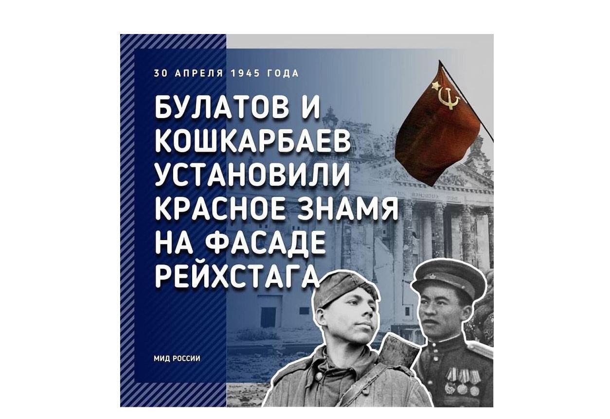 «1945 jyldyń 30 sáýirinde Reıhstag ǵımaratyna shabýyl bastaldy. Ǵımarattyń tóbesine alǵashqy Qyzyl týdy 150-atqyshtar dıvızııasynyń 674-atqyshtar polkiniń jaýyngerleri Raqymjan Qoshqarbaev pen Grıgorıı Býlatov tikti». Reseı Federasııasy Syrtqy ister mınıstrliginiń áleýmettik jelidegi paraqshasynda jaqynda osyndaı jazba paıda boldy. Bul – Reseıdiń 76 jyl ótkennen keıingi resmı moıyndaýy!