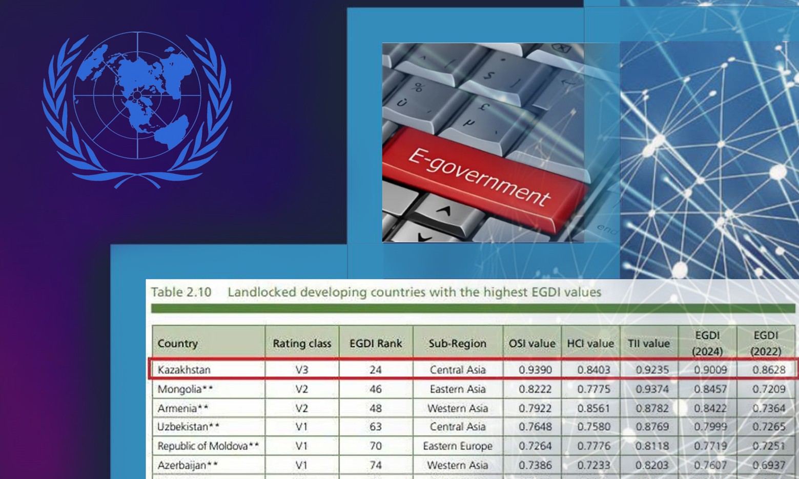 Elimiz sıfrlyq basqarý salasynda jahandyq arenadaǵy deńgeıin nyǵaıtyp keledi. 2024 jylǵy UN E-Government Survey esebine sáıkes, elimiz elektrondy úkimetti damytý boıynsha álemdik reıtıngte 24-orynǵa kóterilip, burynǵy kórsetkishpen salystyrǵanda pozısııasyn 4 satyǵa jaqsartty.