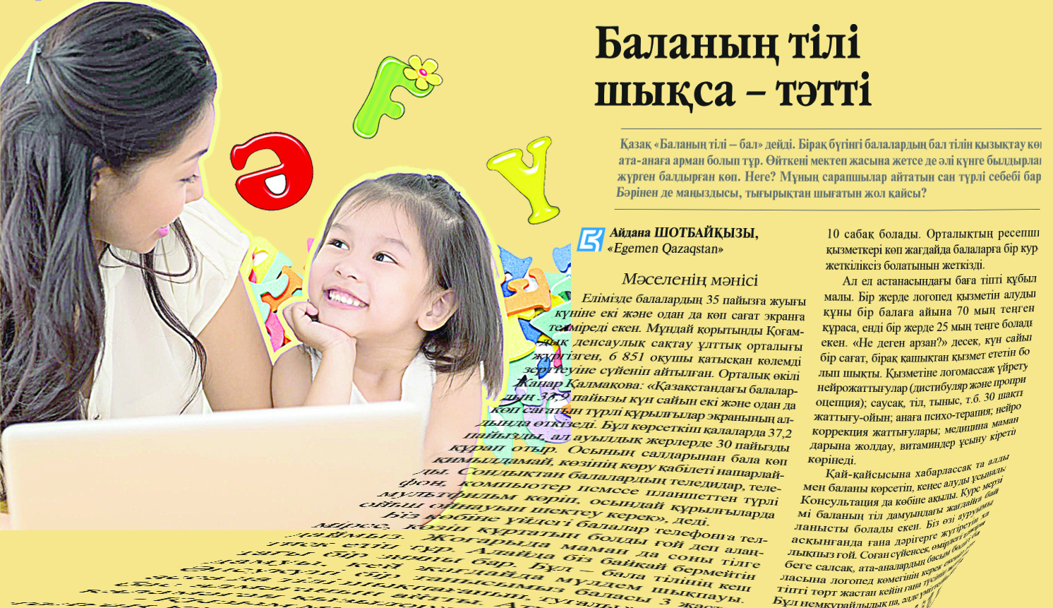 «Egemen Qazaqstan» gazetine jaqynda «Balanyń tili shyqsa – tátti» atty maqala jarııalanǵan bolatyn. Osy bir ózekti másele kóterilgen materıaldan keıin qolǵa qalam aldyq. О́ıtkeni onda áriptesimiz balanyń damýynda ata-ananyń bilimi mańyzdy ekenin aıtypty. О́te oryndy sóz. Al sábıdiń fızıologııalyq, psıhologııalyq, til damý erekshelikterinen habary joq jandardyń tanymyn keńeıtý – biz sekildi mamandardyń mindeti.