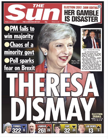 Сайлаудың алғашқы нәтижелері жария болғаннан кейін Тереза Мэй бораған сынның астында қалды. Мысалы, бұрынғы атақты футболшы Гарри Линекер «Бұл маусымда өз қақпасына ең әдемі голды соққан Тереза Мэй болды» деп туит жазса, үкіметтің бұрынғы хатшысы Лорд Тернбулл «Тереза Мэй екі рет оңбай қателесті. Бірі – кезектен тыс сайлау жариялауы, екінші – сайлау науқанын өте нашар жүргізуі. Осылайша оған оңай жеңіс сияқты көрінген нәрсе соңында кішігірім жеңіліс болып шықты» деп Мэйдің сөзсіз отставкаға кетуі керектігін айтты.
