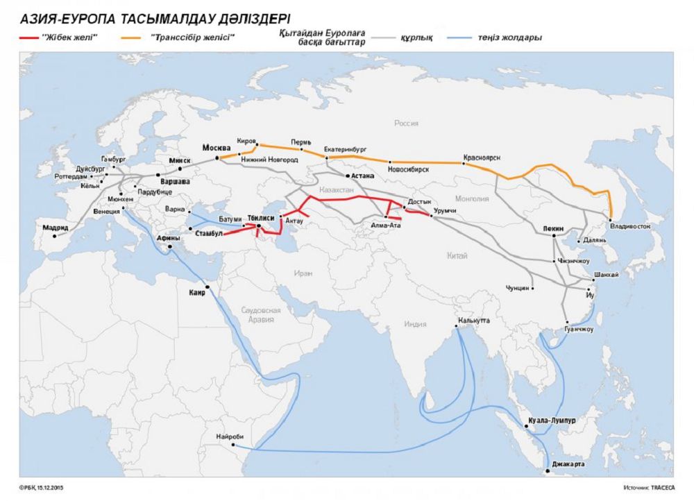 Сонымен қатар Қытайдан Қазақстан мен Ресей арқылы Еуропаға дейінгі бағыттар арасында келесі үшеуін көрсетуге болады: Ресей арқылы солтүстік бағыт; орталық бағыт – TRACECA дәлізі бойынша (Қытай – Қазақстан – Каспий теңізі – Әзербайжан – Грузия – Түркия – Еуропа); әзірше өзінің әлеуетіне жетпесе де – Қазақстан – Түрікменстан – Иран – Түркия – Еуропа бағыты. Астана осы бағыттар бойынша жүктерді сәтті тасымалдауға мүдделі деп айтуға болады.