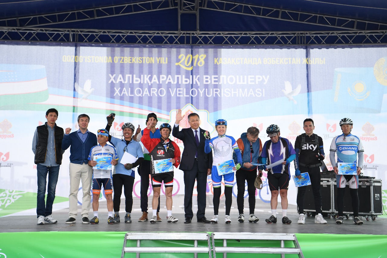 Сондай-ақ, облыс басшысы «Қазақ пен өзбек – түбі бір туысқан халықтар. Екі елдің арасындағы тарихи қарым-қатынас бұрынғы жібек-жолы кезеңінен байлыныс тауып, бауырластық пен достыққа негізделіп келеді. Екі елдің мәдениеті мен салт-дәстүрі, діні, тілі ұқсас. Қазақстан мен Өзбекстан бұл байланысты тәуелсіздік жылдары сақтап қана қоймай, нығайтып, жаңа деңгейге көтеруде. Өзбекстан Президентінің Қазақстанға жұмыс сапары аясында Елбасымыз Нұрсұлтан Әбішұлы Назарбаев Шавкат Мирзиёевпен кездесті. Кездесуде өзбек көшбасшысының биылғы наурыз айындағы мемлекеттік сапары барысында екі ел арасында қол жеткізілген уағдаластықтардың іске асырылу мәселелері талқыланды. Кездесу нәтижесінде 2018 жылы Қазақстан Республикасындағы Өзбекстан жылы болып жариялануына байланысты, екі елдің достастығын арттыру үшін бүгін халықаралық велошеруі ұйымдастырылып, өз мәресіне жетіп отыр. 130 шақырымды құрайтын бүгінгі бұқаралық спорттық іс-шараға қатысушылар қала тұрғындарына үлгі болып, жастарымыздың спортқа деген қызығушылығының артатынына сенімдімін» ,- деді межеге жеткен велошерушілерді күтіп алған облыс әкімі Жансейіт Түймебаев.