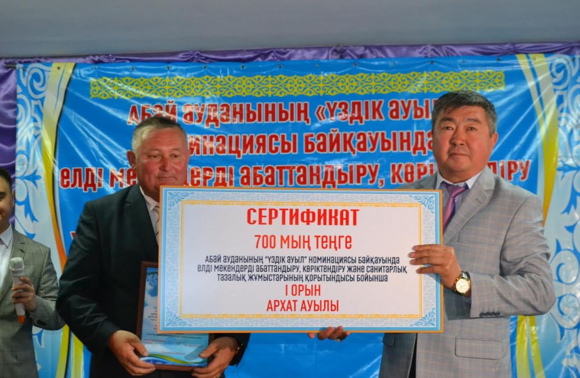 Семинарда «Үздік ауыл» аталымы бойынша 1-ші орынды иеленген Арқат ауылына 700 мың теңгенің сертификаты табысталды. 2-орынға Абай мен Мұхаң туған өңір, Қасқабұлақ ауылы көтеріліп, олар 500 мың теңгенің сертификатын қанжығаларына байлады. Ал 3-ші орын Кеңгірбай би ауылдық округінің еншісіне тиді, сертификаты 300 мың теңге.