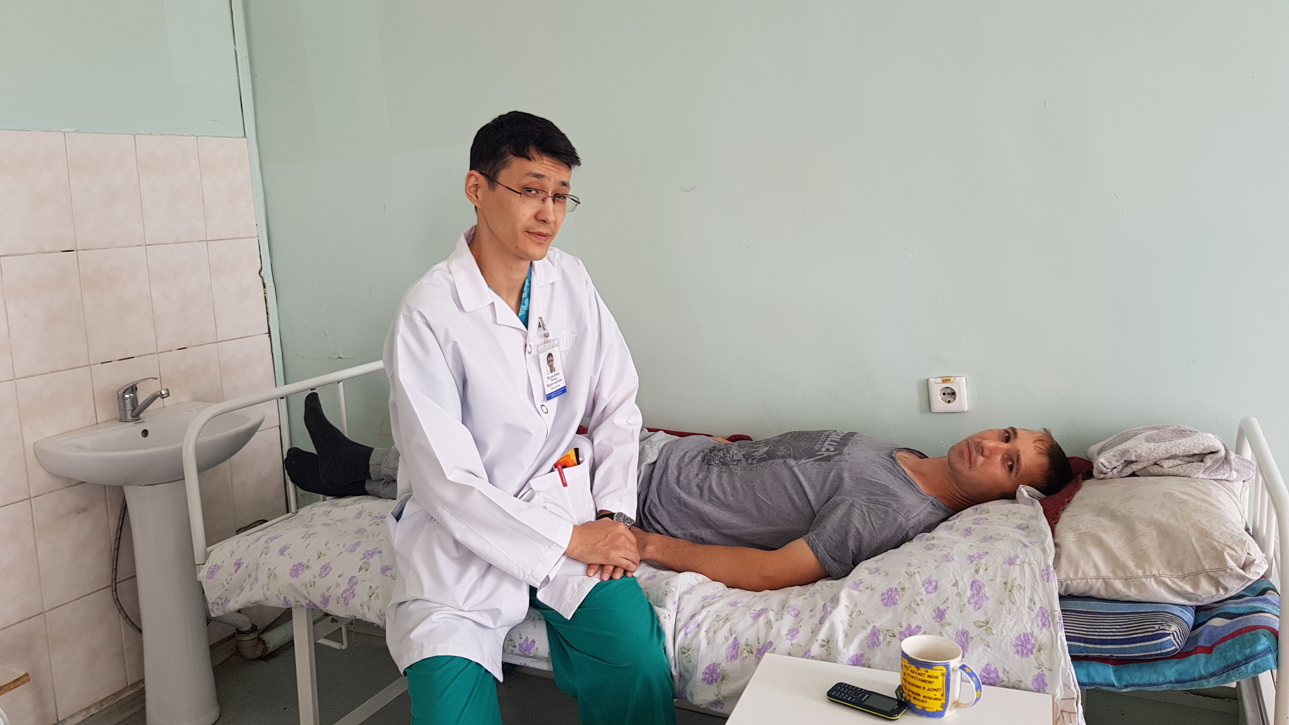 Жас дәрігер, хирург Ринат Мұратханұлы Мұздыбаевты облыстық Денсаулық сақтау басқармасы берген тізімнен ұялы телефоны арқылы тауып, хабарластық. «Жұмыстамын. Келе беріңіз» деді. Келсек, жұмыста екен. Жұмыста болғанда, операция жасап жатыр екен. «Он минут күтіңіз» деген соң уақытты босқа өткізбейін деп дәрігер жұмыс істейтін урология бөлімін аралап, алдымнан шыққан бірнеше бейтаныс кісіні әңгімеге тарттық. «Өте қарапайым. Емделушілерге жақсы қарайды. Өз жұмысын біледі. Ақкөңіл. Ринат Мұратханұлын әріптестерінің бәрі құрметтейді» деді біз ең бірінші «ол кісі қандай адам, қандай маман?» деп сауал қойған осы жерде 16 жылдан бері жұмыс істейтін (қазіргі қызметі – санитарка) Галина Порягина.