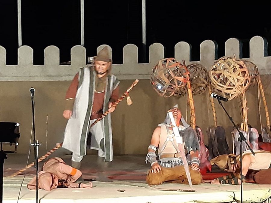 Қазақ топырағында ежелден елге мәлім болған сүйіспеншілік, ғашықтық хикаялары ұлттың ауыз әдебиетінің алтын қорын қалыптастырған дүниелер. Ғасырлар бойы ауыздан ауызға көшіп келген туындылардың бірқатары кейіннен ұлттың ұлы тұлғаларының еңбегімен хатқа да түсіп, халықпен қауышты. Жалпы, «Қозы Көрпеш – Баян сұлу» хикаясы Қарабай мен Сарыбайдың құда болмаққа анттасуынан басталып, кейіннен екеуінің перзенттері Қозы мен Баянның бір-біріне деген сүйіспеншілігімен жалғасып, ақыры қос ғашықтың қайғылы өлімімен аяқталады. Ашық аспан астындағы спектакльде Қозы мен Баянның бейнесі бірден жарқырап көрінді. Театр әртістері Елжан Жармұхамедов пен Нұрай Қаражанова көп жағдайда жаттанды сөзден гөрі қос ғашықтың бір-біріне деген алғаусыз сезімін, адалдығы мен тұрақтылығын қимыл-қозғалысы мен көзқарасы арқылы әсерлі жеткізе білді. Ал Шер шайқы болса жырдағы негізгі оқиғалар мен құбылыстарды үнемі дауылпазын даңғырлатып жеткізіп жүруімен ерекшеленді. Сонымен қатар жырдағы барлық іс-әрекеттер сол оқиғаға қатысы бар басты кейіпкерлердің орындауымен көрерменге жеткізілді. Яғни әрбір оқиға көрерменге кейіпкерлер ойыны арқылы ұсынылды. Қойылымдағы бір ерекшелік – көпсөзділік жоқ. Кейіпкерлер арасындағы диалогтар тым қысқа. Бірақ әрбір кейіпкердің мінез-құлқын, жалпы болмысын әртістер негізінен ишара арқылы алып шыққан. Мәселен, Қарабайдың (әртіс Руслан Оразалиев) шектен тыс пайдакүнемдігі, перзентіне де жылуы жоқ кейпі көпшілікті түрлі ойға жетелегені анық. Ал Баянға ынтық Қодардың (әртіс Жандар Қырықбаев) даңғойлығы мен әпербақандығы да оның қимыл-әрекетінен-ақ көзге ұрып тұрды деуге болады. Сол сияқты үнемі бәріне жақсы көрінуді ойлап, Қарабай мен Қодардың арасына от салып жүретін Жантықтың болмысы да нанымды. Жантықтың екіжүзділігі, оған Қарабайдың да, Қодардың да сеніп қалуы, ақырында Қозы мен Баянның құрбан болуы да сенімді шыққан. Шер мен Жантықтың бейнесін бірдей сомдаған театр әртісі Мәмбет Қожалиевтің шеберлігін айта кеткен жөн. Аталған қойылым көрерменді лирикамен басталып, трагедиямен аяқталғандығына сендіре білді.