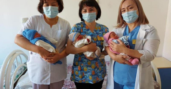 Мерзімінен ерте дүниеге келген үшем периниталдық орталық дәрігерлерінің бақылауына алынған. Медицина қызметкерлерінің көмегімен балалардың жағдайы тұрақты, үшем перзентханадан шығуға әзір.