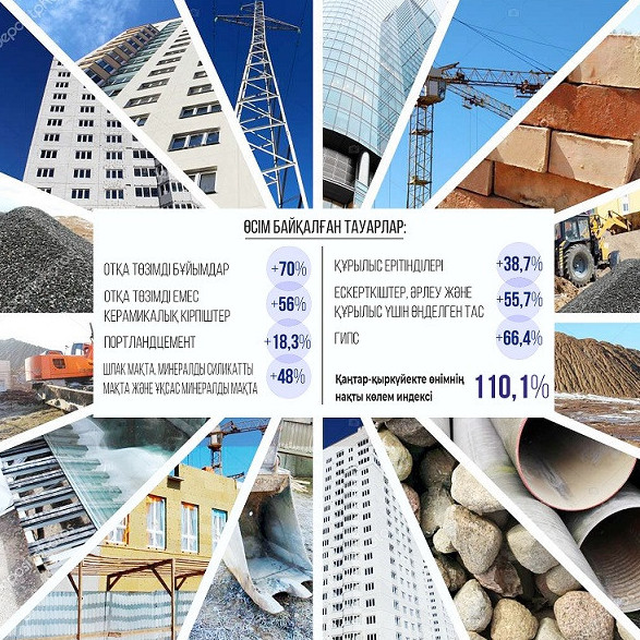 Қаңтар-қыркүйекте өнімнің нақты көлем индексі 110,1 пайызды құраған. Келесі тауарлар бойынша өсім байқалып отыр: отқа төзімді бұйымдар (+70 пайыз), отқа төзімді емес керамикалық кірпіштер (+56 пайыз), портландцемент (+18,3 пайыз), шлак мақта, минералды силикатты мақта және ұқсас минералды мақта (+48 пайыз), құрылыс ерітінділері (+38,7 пайыз), гипс (+66,4 пайыз), ескерткіштер, әрлеу және құрылыс үшін өңделген тас (+55,7 пайыз). Сондай-ақ керамикалық қаптауыш кірпіштер (-8,5 пайыз), тақталар, тақтайшалар және цементтен, бетоннан немесе жасанды тастан жасалған ұқсас бұйымдар (-8,9 пайыз), бетоннан жасалған құрама құрылыс конструкциялары (-10,6 пайыз), тауарлық бетон (-10,4 пайыз) секілді тауарлардың көлемі төмендеген.