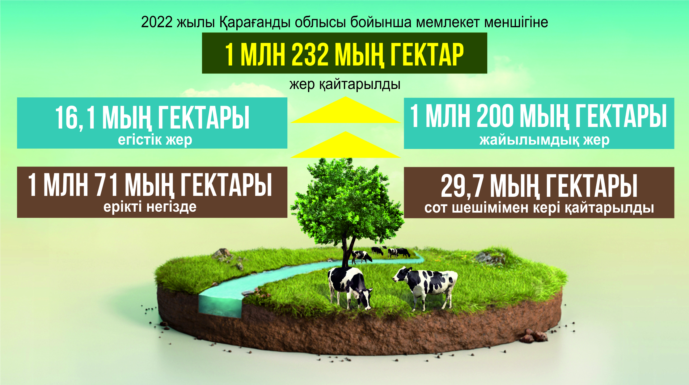 Бұған қоса 232 мың гектар аумақта шалғайдағы жайылымдар ұйымдастырылыпты. Халық мал жаюы үшін 252 мың гектар жер ауылдық округ әкімдеріне уақытша өтеусіз пайдалануға берілгенін айтты басқарма басшысы Дарын Бұлқайыр. Жалпы, жер қатынастары басқармасының мәлімдеуінше, 2022 жылы облыс бойынша мемлекет меншігіне 1 млн 232 мың гектар жер қайтарылған екен. Оның 16,1 мың гектары – егістік, 1 млн 200 мың гектары – жайылым. Мұның 1 мл 71 мың гектары – ерікті негізде, 29,7 мың гектары сот шешімімен кері қайтқан.