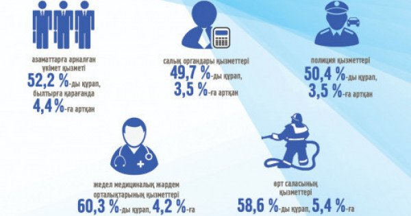 Memlekettik qyzmetterge halyqtyń qanaǵattaný deńgeıi mynadaı: azamattarǵa arnalǵan úkimet qyzmeti 52,2 paıyzdy qurap, byltyrǵa qaraǵanda 4,4 paıyzǵa; salyq organdary qyzmetteri 49,7 paıyzdy qurap, 3,5 paıyzǵa; polısııa qyzmetteri 50,4 paıyzdy qurap, 3,5 paıyzǵa; jedel medısınalyq járdem ortalyqtarynyń qyzmetteri 60,3 paıyzdy qurap, 4,2 paıyzǵa; órt salasynyń qyzmetteri 58,6 paıyzdy qurap, 5,4 paıyzǵa artqan.